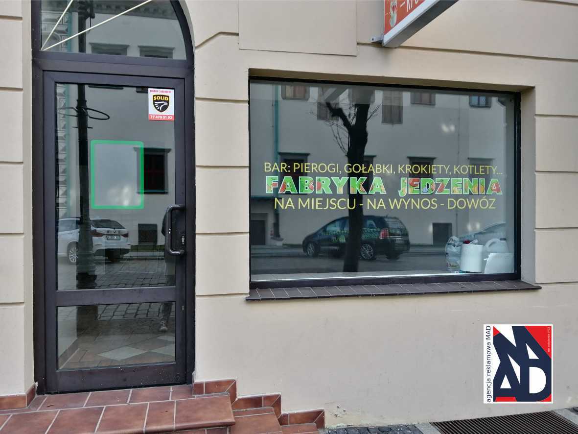 • Potrzebujesz oznakować lokal ale nie chcesz zasłaniać wnętrza? Np. w przypadku restauracji, gdy przyszłych gości zachęcają potrawy widziane na stołach, albo ciekawe wnętrze. A przy tym klient siedząc wewnątrz może podziwiać widoki za oknem? Proponujemy delikatną grafikę wyciętą w folii w formie napisów czy grafik bez tła. Można je wykleić od wewnątrz lokalu - wówczas patrząc z zewnątrz są delikatniejsze, mniej rzucają się w oczy. Lub można aplikować je od zewnątrz i do tego np. foliami matowymi, w tej sytuacji napisy będą delikatnie kontrastować z błyszczącą powuierzchnią szyby.
